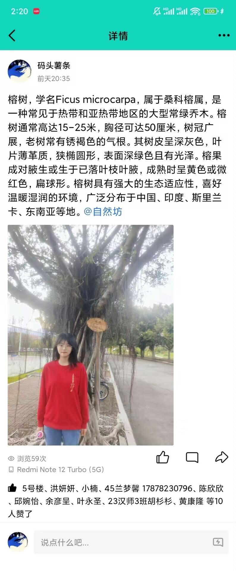 本次活动面向全体学生,主题是“自然之光,科学之光”。活动分为三部分:一、校园内植物打卡活动,11月4日-7日,学生与校园里的植物合照打卡并发布QQ空间,空间内容包括植物名字、对本植物的了解和认识并@自然坊的官Q。二、线下观影活动,11月5日下午15:00,学生在求实楼C区201进行线下观影活动,观看影片《风之谷》。三、植物科普节讲座,11月9日下午14:30,在求实楼C区201举办植物科普节讲座,由自然坊指导老师刘凯良老师主讲,分享植物科学保护、生态平衡维护相关知识。经过六天时间,本次活动圆满完成。
