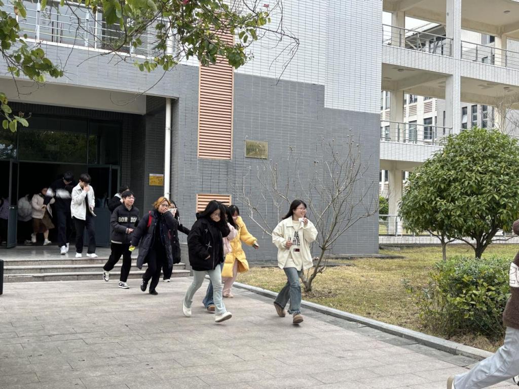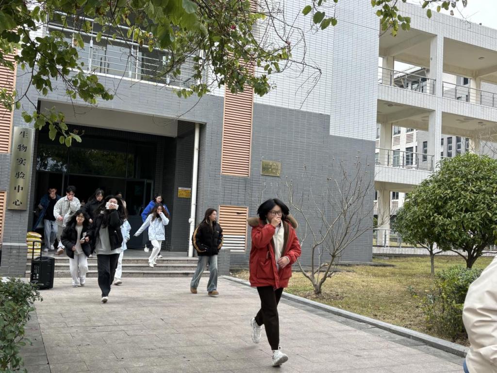 演练正式拉开帷幕。随着应急警报骤然响起,生物实验楼内的学生们迅速反应,按照预定疏散路线有序撤离。在老师的悉心引导下,学生们用手捂住口鼻,低姿前行,快速且有条不紊地向指定安全区域集合。疏散至安全区域后,老师们认真清点人数,确保全体学生均已安全撤离。整个演练过程紧张有序,达到了预期效果。