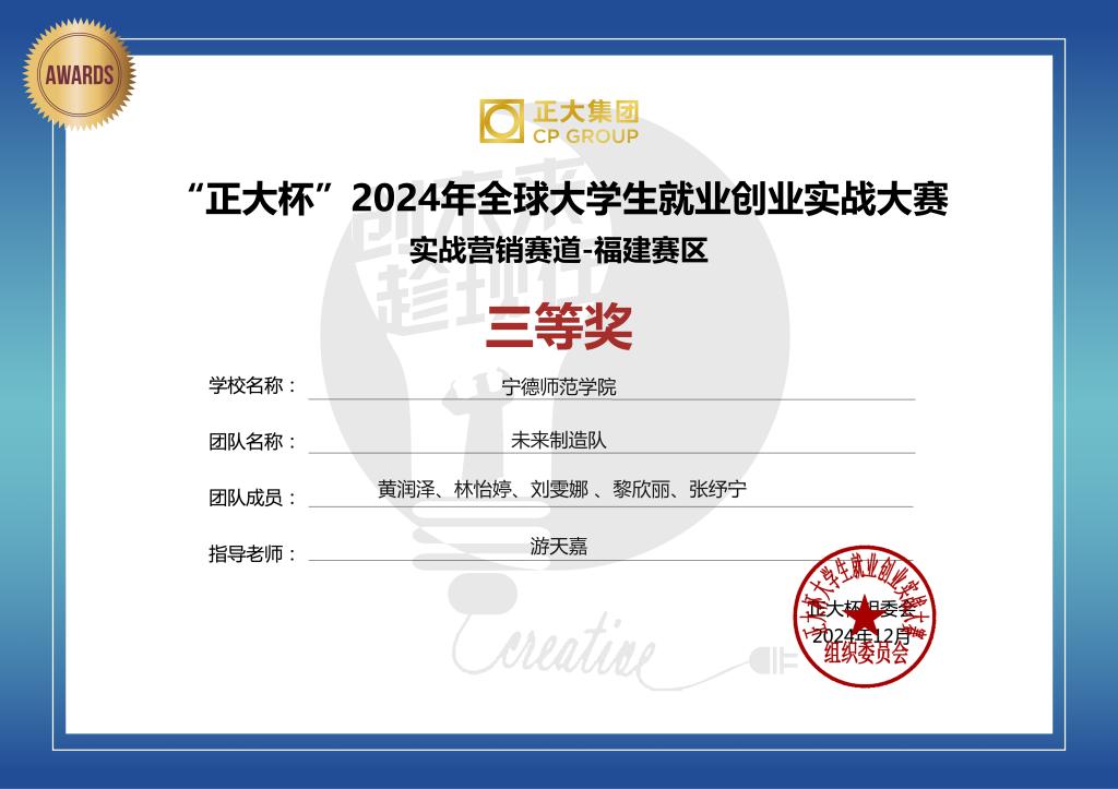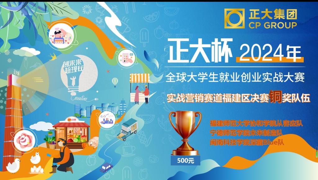 近日,“正大杯”2024年全球大学生就业创业实战大赛福建赛区评选结果揭晓。宁德师范学院正大产业学院未来制造队凭借创新方案与实战能力,在实战营销赛道中表现优异,斩获铜奖,展现了学院深化产教融合、培养应用型人才的育人成效。
