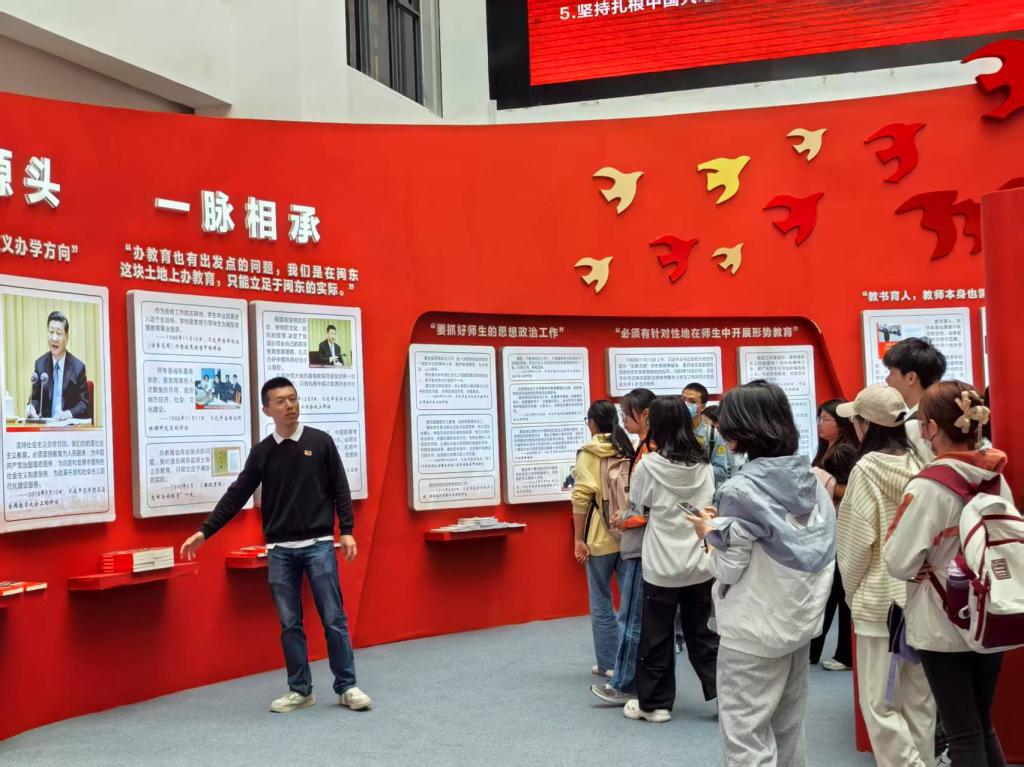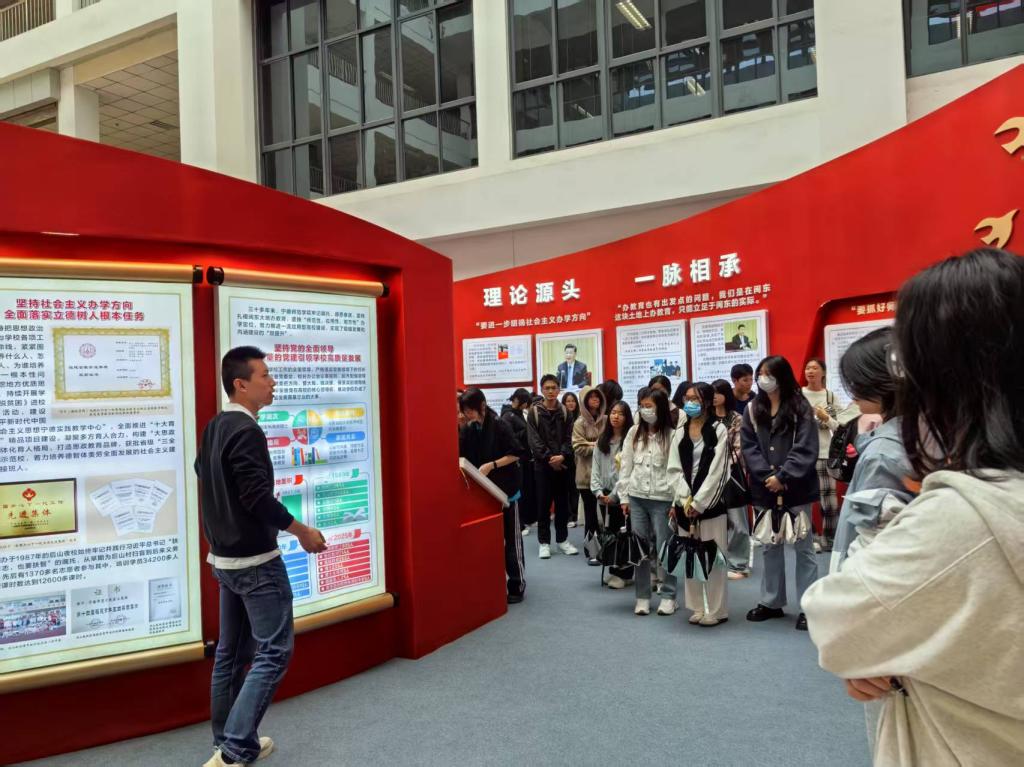在参观过程中,张承康和王巍同志详细讲解了习近平总书记“六进宁师”的重要意义和深刻内涵,引导学生们深刻领会总书记关于教育、科技、人才等方面的重要论述。学生们认真聆听,不时驻足观看展板上的图文资料,深受启发。
