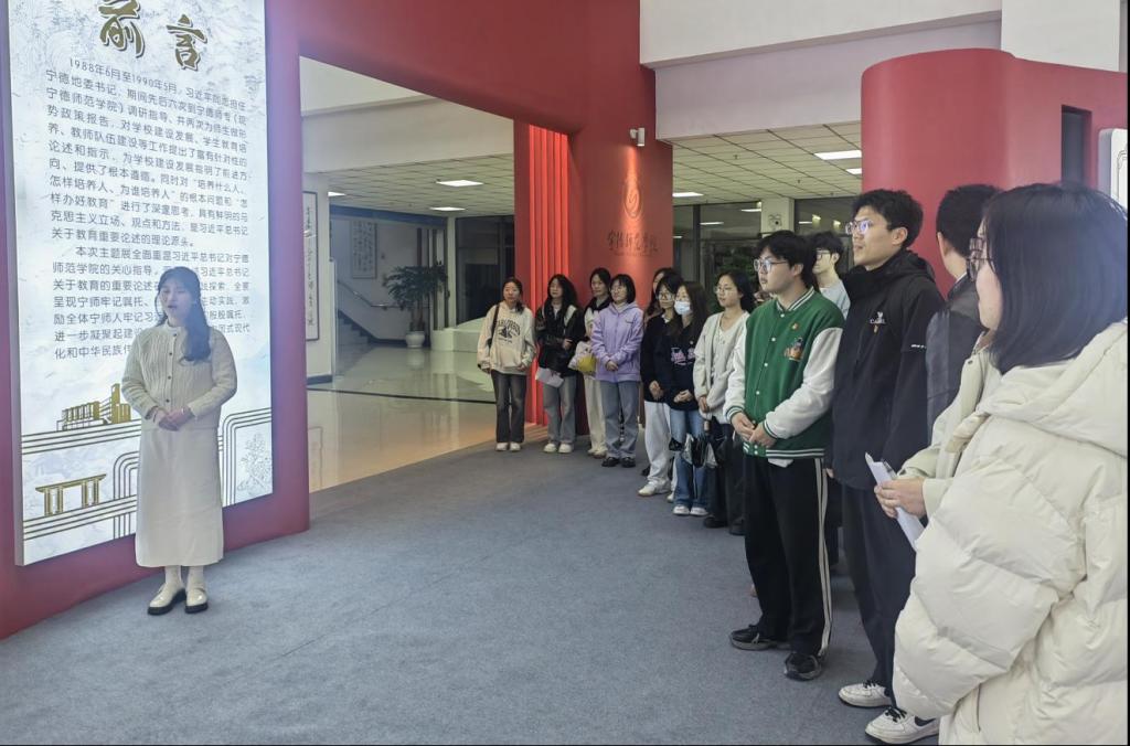 本次活动主要分为三个部分。首先,全体师生党员参观了图书馆习近平总书记“六进宁师”主题展,深入领会宁师人应以2035年建成教育强国为战略指引,深入学习贯彻习近平总书记关于教育的重要论述,全面落实立德树人根本任务,科学编制“十五五”规划,深化教育改革创新,着力推进一流应用型高校建设的使命。