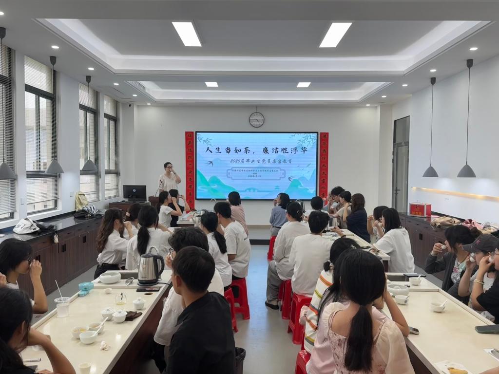 活动中,与会党员共同品茶,细细感受茶的苦、涩、清、香、甘。林姗书记以“人生当如茶,廉洁胜浮华”与全体毕业生党员共勉,要学习茶之清、俭、和、静,让廉洁成为一种生活习惯。祝愿他们在未来的征程中始终保持清正廉洁的本色,书写无愧于党、无愧于人民、无愧于时代的华章。