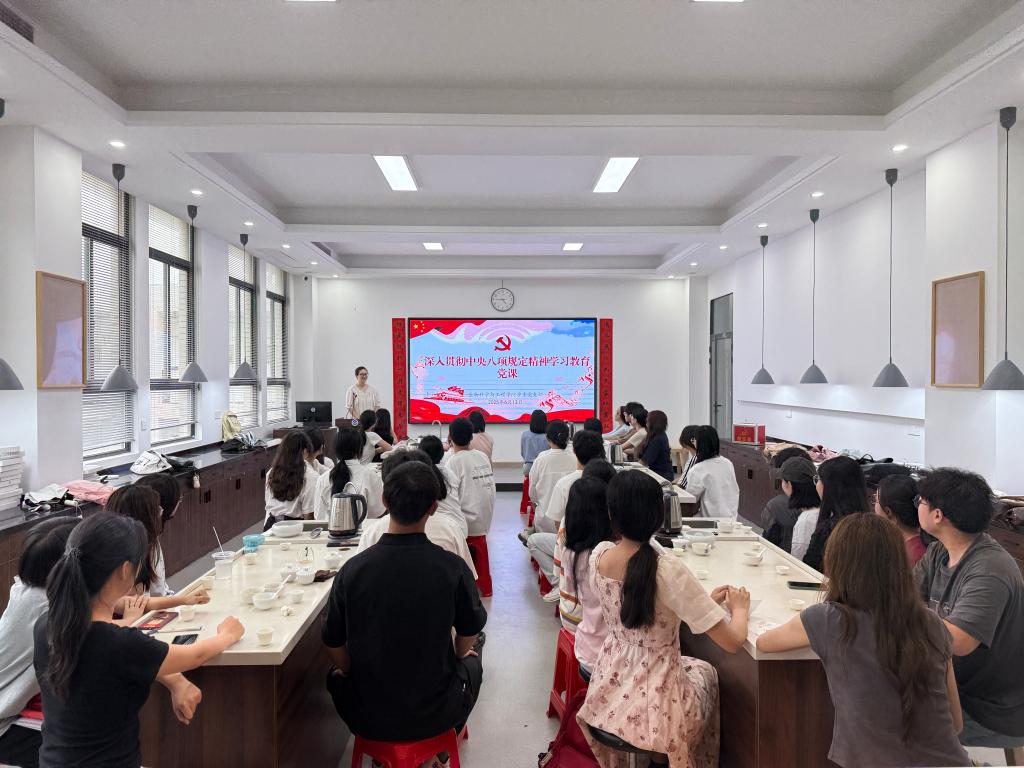 党课伊始,与会党员共同回顾了中央八项规定及其实施细则精神。在精神解读环节,党支部书记林姗强调,贯彻落实中央八项规定精神体现了一种思想自觉、行动自觉,并倡导全体党员必须坚持厉行勤俭节约、倡导廉洁从政、弘扬务实作风。此次党课还通过正反案例学习,一方面进行警示教育,另一方面以榜样引领,对全体党员提出殷切期望:既严谨治学、追求真理,又以身作则、抵制诱惑,让深入贯彻中央八项规定精神学习教育成为学习和职业生涯的鲜明底色。
