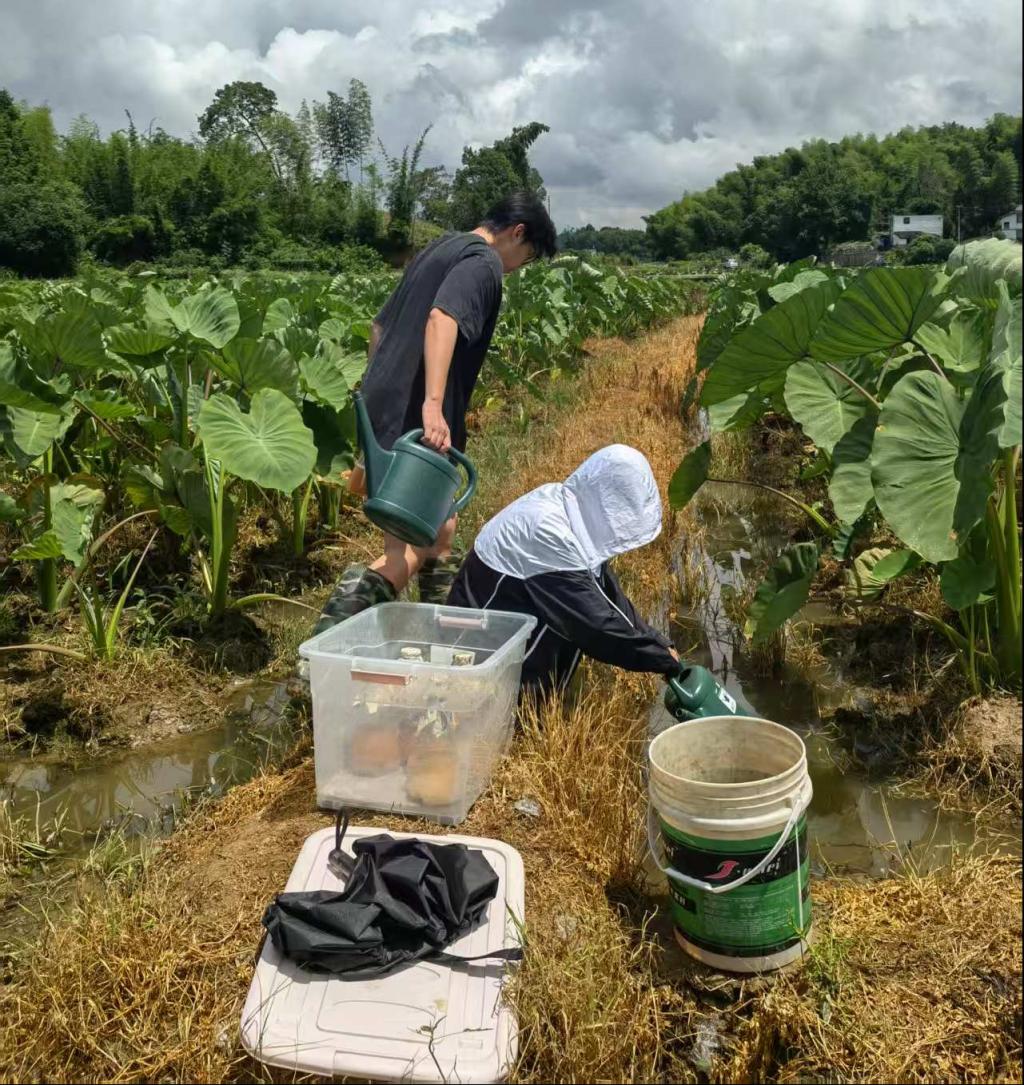 团队随后走访福鼎市隆雄槟榔芋专业合作社种植基地,开展科研实践活动。师生深入田间地头,喷洒槟榔芋软腐病生物防治菌剂,结合专业优势为农户提供技术指导。随后,教师党支部与合作社党支部开展共建座谈。林志斌书记表示,学院将充分发挥生物技术、农业资源开发等科研优势,帮助合作社突破槟榔芋病虫害防治、品种认定等瓶颈问题,推动产学研成果转化。合作社党支部书记洪吉雄高度认可校地共建模式,希望以党建为纽带,持续深化技术合作。