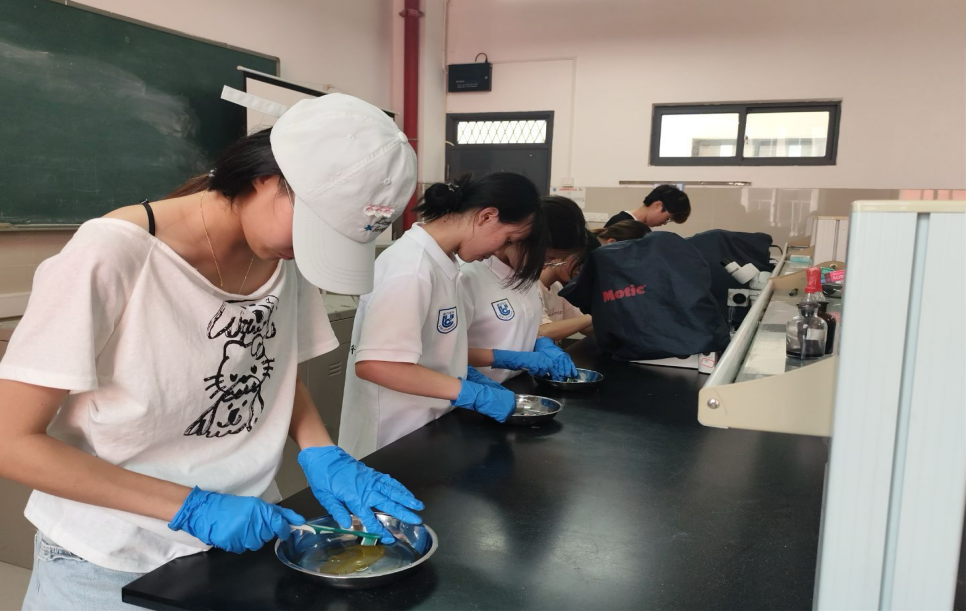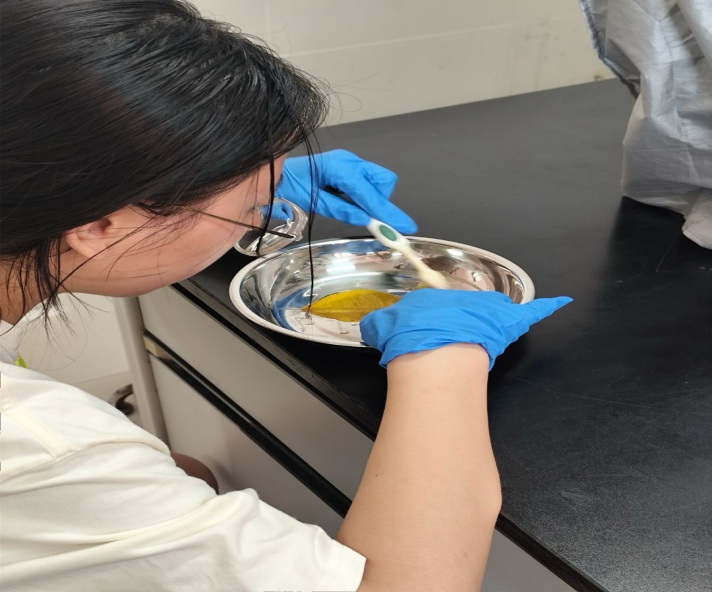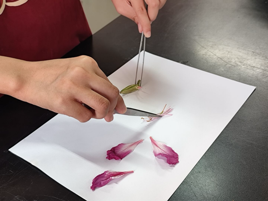 植物学认知与实践是本次培训的另一重点。刘凯良老师以红花羊蹄甲花朵为鲜活教具,现场进行细致解剖,系统讲解了花柄、花托、花瓣、雄蕊、雌蕊等植物花器官的结构特征,加深了学员们对植物形态学知识的理解。培训的压轴环节是趣味性与实践性并重的叶脉书签制作。在队长余雅婷同学详细介绍了制作原理与步骤后,学员们亲手操作,将叶片经过氢氧化钠溶液安全煮制、小心剥离叶肉、染色修饰,最后过塑定型,成功完成精美的叶脉书签。这一过程不仅锻炼了大家的动手能力和标本处理技巧,更直观展现了植物组织结构的奥妙。